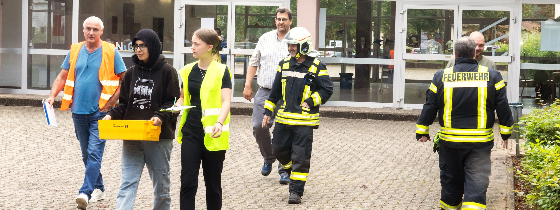 Dann ist der Moment gekommen: Wir stehen vor dem Brandmelder, Frank Dick entriegelt das kleine Schutzfenster, ein kurzer Knopfdruck – und schon hallt der Alarmton durch die Flure. Thomas Lieser, Mitglied der Schulleitung und Lehrkraft, tritt prompt mit der „Notfallbox“ aus dem Lehrerzimmer. Er trägt außerdem die Rettungsweste, die ihn als Ansprechperson für die Einsatzkräfte kennzeichnet. Zügig treffen auch die Schülerinnen und Schüler ein, die zum Schulsanitätsdienst gehören. Sie erhalten von Lieser ihre Westen, die Klemmbretter, Stifte und Klassenlisten, denn ihre Aufgabe wird es draußen sein, die Anwesenheiten abzufragen.