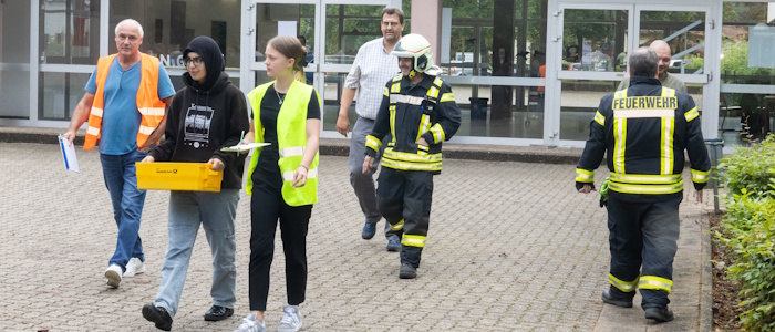 Frank Dick wirft einen Blick auf die Uhr: „Das hat 15 Minuten gedauert – vom Auslösen des Alarms bis zum Bericht an die Feuerwehr. Das können wir sicher noch etwas schneller.“ Trotzdem sind der stellvertretende Schulleiter und auch die Feuerwehr zufrieden. Alle haben sich an der definierten Sammelstelle eingefunden, die Ansprechpersonen waren eindeutig zuzuordnen und alle Rückmeldungen liefen an einer Stelle zusammen, sodass die Feuerwehr umfassend informiert werden konnte. Bei einem Blick auf Schülerschaft und Lehrkräfte fällt auch auf, dass niemand eine Tasche oder andere unnötige, schwere Dinge bei sich hat: Es haben alle auf schnellstem Weg und ohne Verzögerung die Schule verlassen.