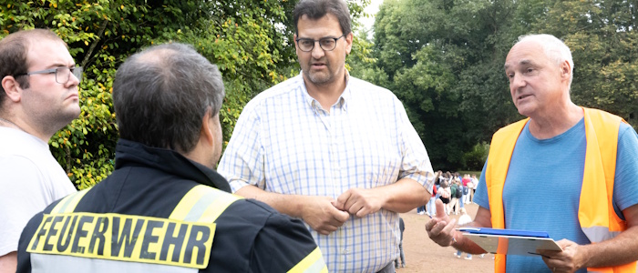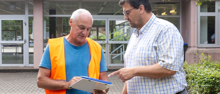 Auch die Einsatzkräfte sind schon vor dem Schulgebäude eingetroffen. Der stellvertretende Wehrleiter Thomas Fuchs geht direkt auf Frank Dick und Thomas Lieser zu – im Ernstfall würde er nun über die Details des Alarms nach aktuellem Wissensstand informiert werden, um die weiteren Schritte einzuleiten. In welchem Gebäudeteil wurde der Alarm ausgelöst? Was wurde beobachtet? Wie ist der aktuelle Stand zu Personen im Gebäude? Frank Dick legt großen Wert darauf, die lokalen Einsatzkräfte in den Probealarm einzubeziehen. Nicht nur, um die Räumung situationsgetreu zu proben, sondern auch um sich kennenzulernen und damit die Einsatzkräfte ein Gespür dafür bekommen, wie die Schule aufgestellt und die Abläufe geregelt sind. „Für die Feuerwehr ist es am wichtigsten zu wissen, an wen sie sich wenden können und dann schnell zu erfahren, ob alle Personen das Gebäude verlassen haben. Denn wenn jemand fehlt, wird aus einer Brandbekämpfung eine Menschenrettung, dann muss der Einsatzleiter einen ganz anderen Einsatz abwickeln.“