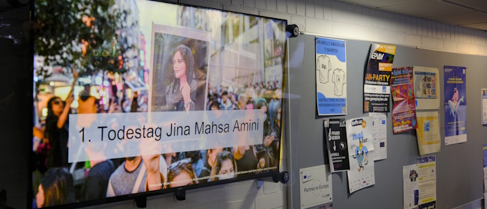 „Die AG ist keine geschlossene Gesellschaft“, betont Simon, „wir sind für alle offen.“ Und für alle sichtbar, beispielsweise über den Bildschirm, der im Loungebereich vor dem Zugang zur Sporthalle hängt. „Da warten die Klassen immer, bevor sie zum Unterricht in die Halle können“, sagt Ben. „Wenn sie nicht gerade hinter ihren Smartphones abtauchen, schauen sie auf unseren Bildschirm.“ Dort flimmern neben Nachrichten zu AG-Aktionen auch Informationen zu Geschehnissen, die den Teilnehmenden wichtig sind, beispielsweise die Geschehnisse rund um das Schicksal der 23-jährigen Jina Mahsa Amini, die im September 2022 in Teheran von der iranischen Sittenpolizei festgenommen, geschlagen und tödlich verletzt wurde. „Wir wollen die Aufmerksamkeit auf bestimmte Themen lenken und Diskussionspunkte setzen“, sagt Ben. „Wenn die Leute sich dann darüber austauschen, haben wir unser Ziel erreicht: Wir wollen hier an der Schule etwas anstoßen und Denkmuster verändern.“