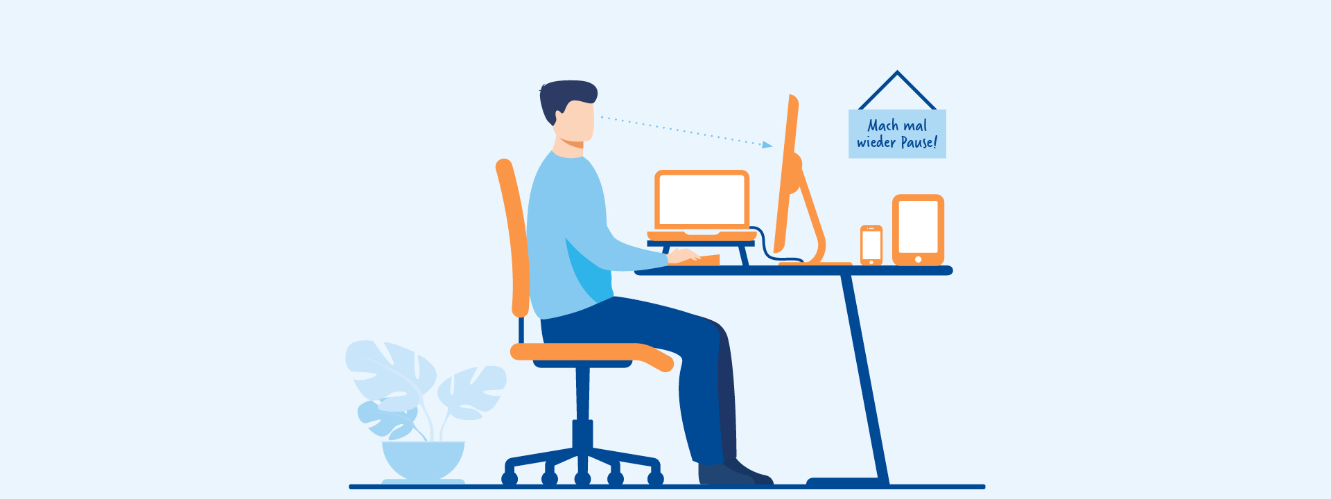 Legen Sie bei der Arbeit mit digitalen Endgeräten regelmäßige Pausen ein. Lassen Sie Ihren Blick gezielt in die Ferne schweifen. Orientieren Sie sich an der 20-20-Regel: alle 20 Minuten den Blick vom Monitor abwenden und für 20 Sekunden ein mindestens sechs Meter entferntes Objekt fokussieren. Ausgleichsübungen in den Pausen helfen, einseitigen Belastungen vorzubeugen und gleichzeitig die Konzentrationsfähigkeit wiederherzustellen.